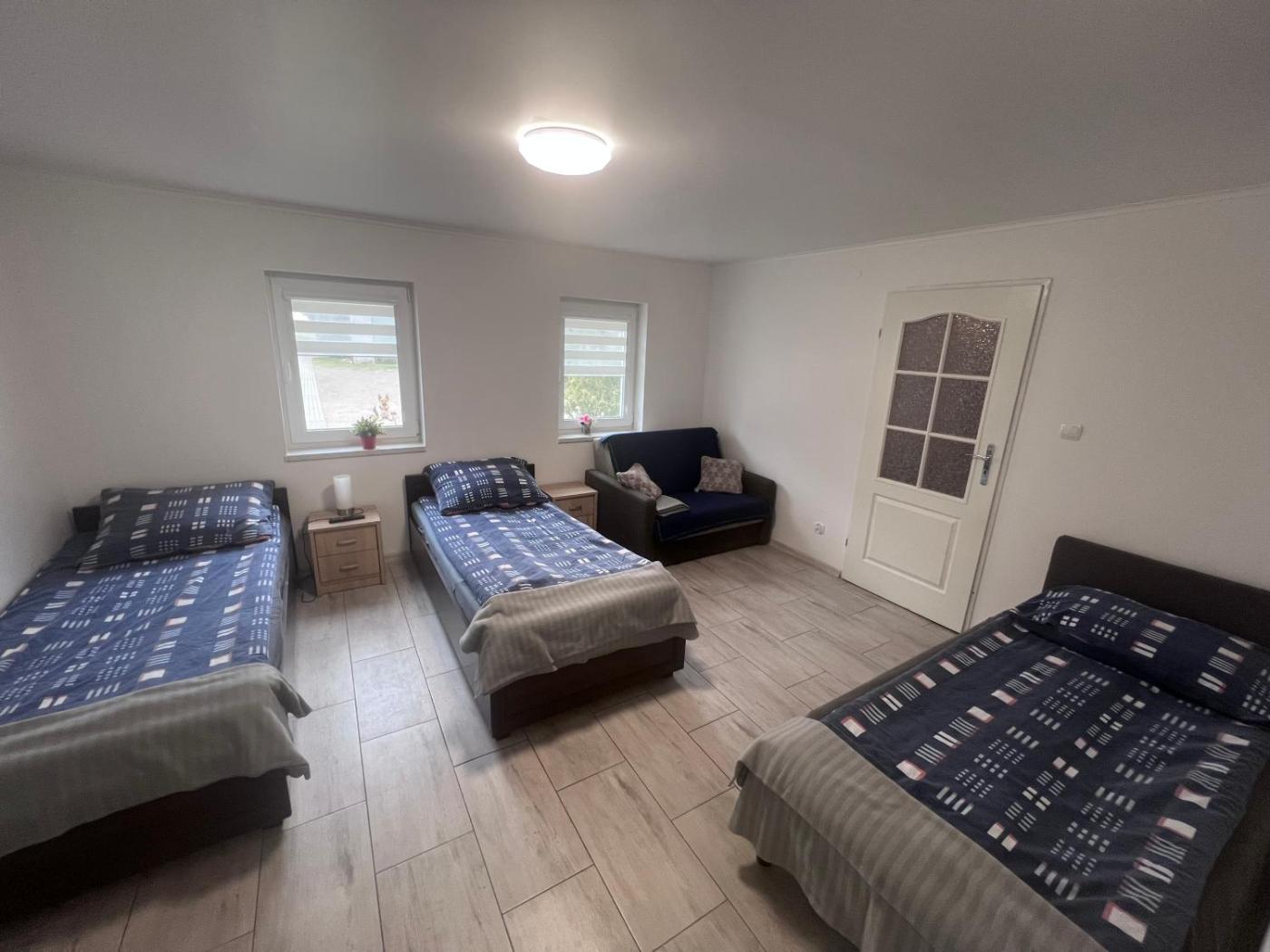 Pokój trzyosobowy. The triple room features a dining area, a wardrobe, an electric kettle, heating, as well as a flat-screen TV. The unit has 3 beds. Pokój Trzyosobowy - 3 osobowy. Powierzchnia pokoju ok.: 21 mkw.