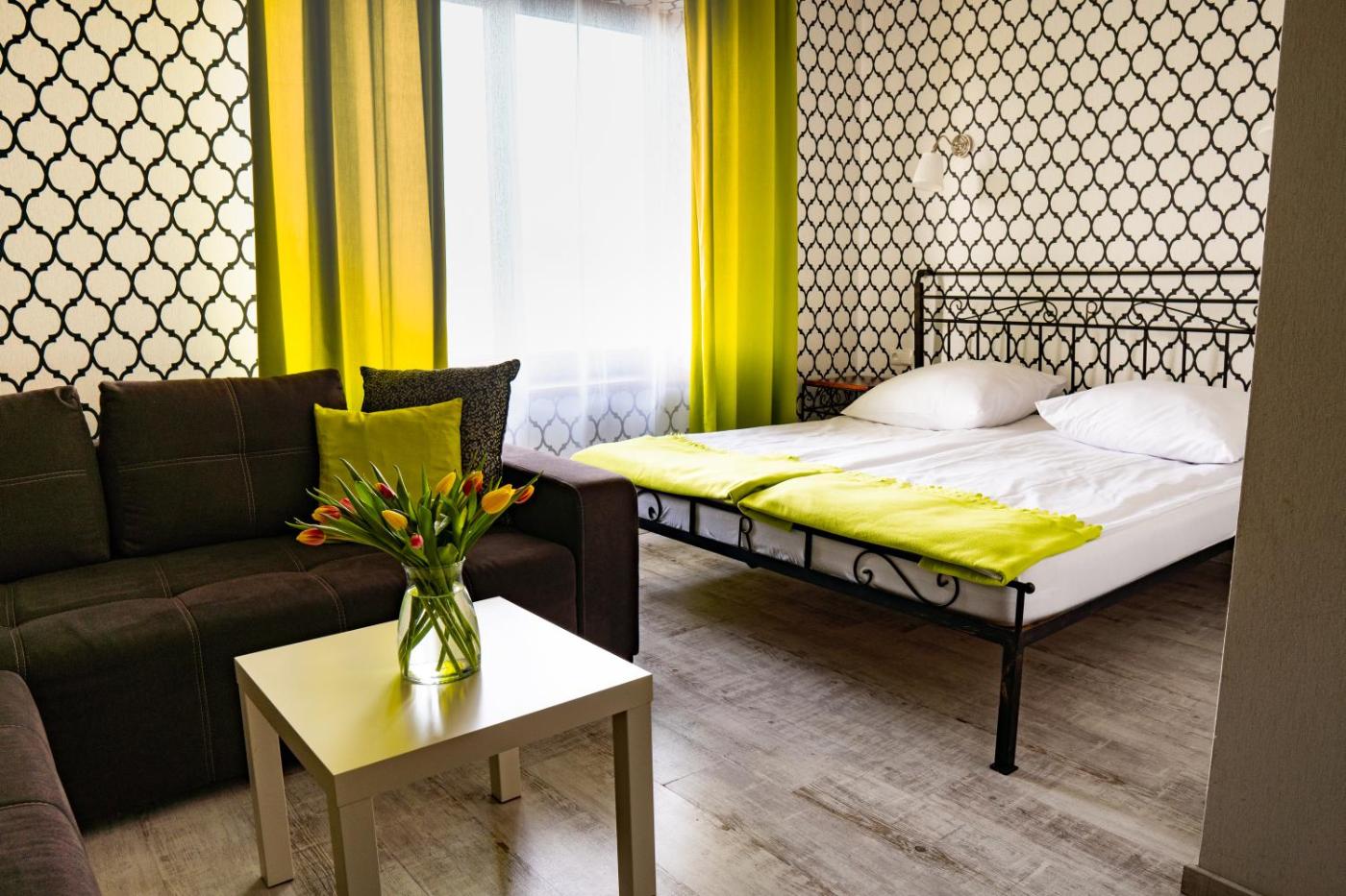 Apartament typu Studio z widokiem na ogród. The spacious studio has a private bathroom, a private entrance, a tea and coffee maker, as well as a seating area with a flat-screen TV. Guests can make meals in the kitchenette that features a stovetop, a refrigerator, kitchenware and a microwave. The studio features a dining area, a wardrobe, a sofa, a TV, as well as lake views. The unit has 5 beds. Studio - 6 osobowy. Powierzchnia pokoju ok.: 69 mkw. ;